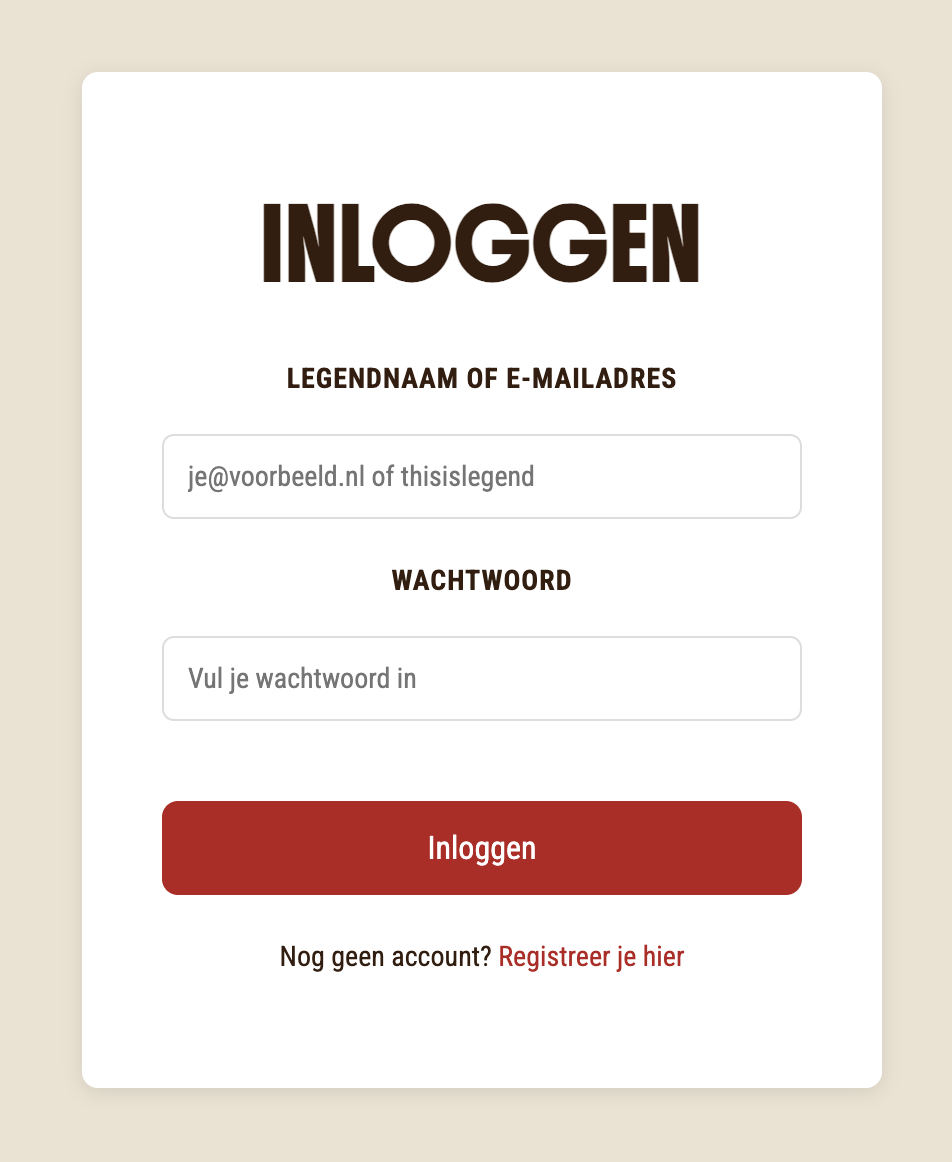 Meld je aan met je e-mail en kies een unieke Legend-naam. Deze naam gebruik je in het spel en is zichtbaar voor andere spelers.